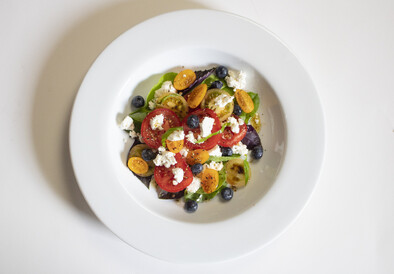 Place the salad leaves in a large shallow bowl or on a dinner plate. Crumble half the cheese on top. Arrange the sliced tomatoes over the cheese. Top with more crumble cheese. Garnish with the blueberries and sliced basil. Season.