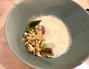 Sunchoke Veloute, Ham Hock. Pickled Pear. Celery, Allium