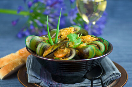 Heat the oil in a large saucepan or stock pot on medium-low. Sauté the ginger, onion, garlic, makrut lime leaves and lemon rind, until softened. Add the wine and coconut cream and simmer until the liquid has almost evaporated. Add the stock, curry powder, chilli paste, fish sauce and lemon juice and simmer for 5 minutes.