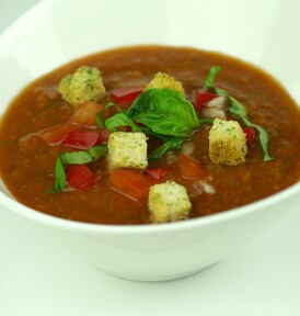 To make the topping, seed the pepper and dice. Dice the onion and tomato. Serve on top of the soup with the croûtons, basil, salt and pepper. Serves 6.