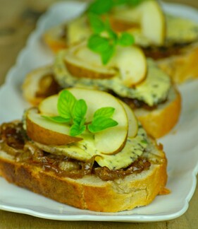 Thinly slice the cheese into 4 pieces. Quarter, core and slice the pears. Spread the toasted ciabatta with the onion jam. Top with the cheese, pears and herbs or watercress. Serves 4.