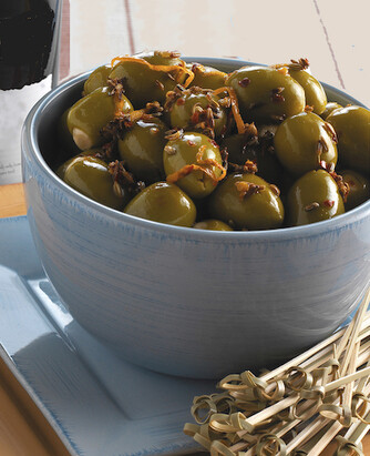 Tip: These olives can be stored in a screw-top jar in the refrigerator for up to 2 weeks. Warm slightly before serving