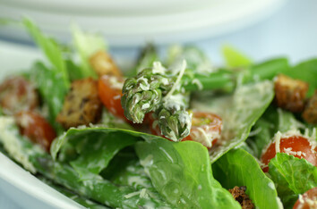In a large bowl, combine the cos, asparagus, cherry tomatoes and bread croutons. Toss with a little of the dressing. Sprinkle with the parmesan and serve immediately. Serves 3-4.