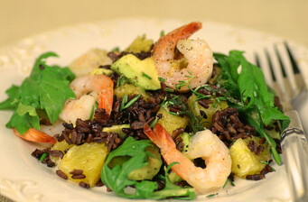 Combine with the rice and salad greens in a large bowl. Gently fork in the oranges and avocados. Whisk the olive oil, lemon juice and salt and pepper to taste. Gently stir through the salad. Top with the prawns. Serves 4.