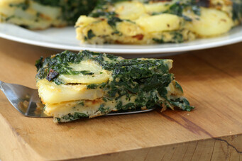 Place under the grill to cook the top. Carefully shake the omelette onto a plate, then flip over back into the pan to finish cooking. Cut into wedges to serve. Serves 6-8.