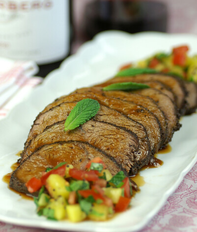 Stand tented with foil for 5-10 minutes before slicing. Any juices can be used in a gravy. I used Essential Cuisine Lamb Jus simmered for a few minutes together with the juices. Serves 3.