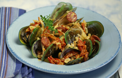 Once the mussels start to open after 2-3 minutes, add the wine. Cover and cook, shaking the pan occasionally. Remove the mussels to a warm bowl as they open. Discard any that do not open. Add the chorizo and cream to the liquid in the saucepan. Simmer until slightly reduced. Season. Pour over the mussels and serve.