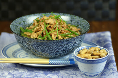 Based on chef Ken Hom's delicious recipe for Chicken Chow Mein. Because we are such a meat-eating nation I doubled the amount of chicken plus served it with cashew nuts to bring good fortune in the New Year.
