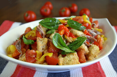 Place the shallots, peppers, bread and basil leaves in a large serving bowl. Shake the tomatoes in the sieve then add to the serving bowl.