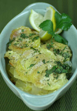 Spray a 29cm x 21cm baking dish with oil. Pat the potatoes dry with a paper towel. Layer in the baking dish, overlapping each slice a little and placing a little butter between each layer.