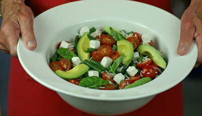 Halve the cherry tomatoes. Halve, stone and peel and avocados. Cut into quarters. Combine all the salad ingredients in a large bowl.