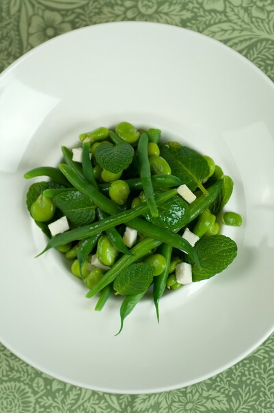 Blanch the beans separately in boiling water for about 2 minutes. Drain and refresh in icy water. Remove the skins from the broad beans.