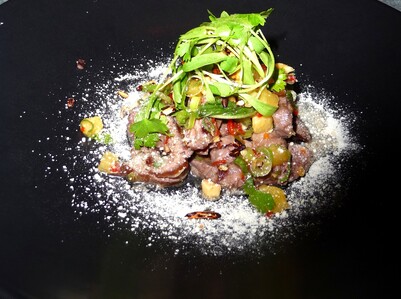 But back to the menu that offers small plates you can mix and match, a little like a degustation menu. Dinner — Two courses: $60. Three Courses: $80. Fours courses: $80. Five courses: $105. The wine list is, quote 'not your ordinary wine list.' Our choice — 2012 Saint Clair Bull Block Grüner Veltliner ($56.00).