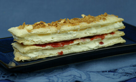 A thousand leaves — also known as Napoleon — is a quick-to-make sweet treat to serve with coffee or after dinner. It is based on a recipe from Penguin Cordon Bleu Cookery and although their recipe uses a block of puff pastry I have chosen ready-rolled pastry sheets.