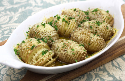 Place in a baking dish just large enough to hold the potatoes comfortably. Combine the butter and oil and brush generously over the potatoes. Bake for 20 minutes and brush with more butter/oil mixture. Continue baking for about 20 minutes or until cooked. Brush with more butter/oil, season and sprinkle with the parmesan. Bake until the cheese is melted. Serves 6-8.