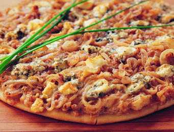 Stir the egg, sour cream, walnuts, salt and pepper into the onion mixture. Spread over the pizza base right to the edge. Crumble the blue cheese over the top.