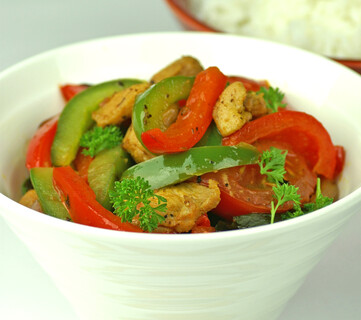 Heat the remaining oil. Stir-fry the chicken in batches, until cooked, about 6 minutes. Return the vegetables to the pan with the tomatoes. Stir-fry for 1-2 minutes until heated through. Serves 4.