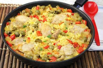 Add the rice, stock, chicken and olives. Bring to the boil, reduce the heat to a simmer, cover, then cook for about 30 minutes, stirring halfway through. The rice should still be a little firm. Remove from the heat and stand for 10 minutes before serving. Serves 4-6.
