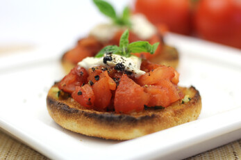 Spread the split muffins with the combined spread ingredients. Combine the tomatoes with the olives, black pepper and lemon juice. Using a slotted spoon, pile on the muffins. Top with a piece of mozzarella.