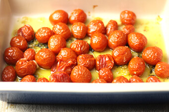 Meanwhile, fry the tomatoes in oil until just softened. Season.