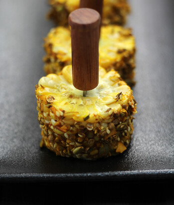 Remove the husks and cut the cob into 3cm rounds. Brush with egg white then roll in dukkah until well coated. Microwave for 1-2 minutes until hot. Serve as nibbles with drinks. Makes 5-6