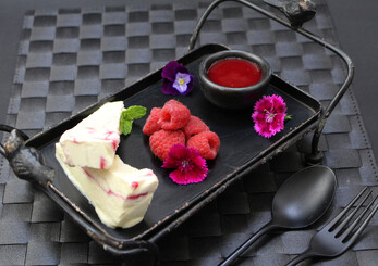 Line a 23cm x 13cm loaf pan with plastic film. Pour half the cream mixture into the pan. Drizzle 2 tablespoons of the raspberry sauce along the mixture then zig-zag it with a knife. Add the remaining cream then another 2 tablespoons of the sauce and zig-zag it again to make a ripple effect. Cover with film pressing it gently onto the surface. Freeze.