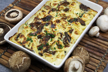 In a large bowl combine the cream, ricotta, mozzarella, garlic and parmesan. Mix well then add the mushrooms and pasta. Pour into a 25cm x 16 cm baking dish. Cook on fan-bake for 15 minutes until hot and browned on top. Serves 2 as a main or 4 as a side.