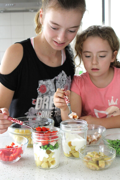 To assemble, place the pasta in the base of two jars. Top with the mayo mixture. Then layer the other ingredients in the order that you wish. Screw the top on and keep cool. Serves 2.