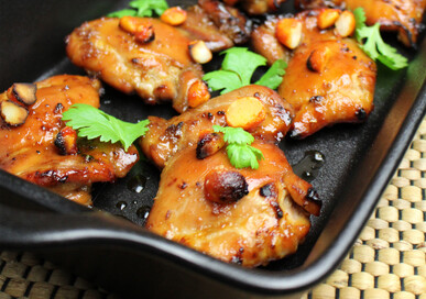 Line a grilling pan with foil. Place the chicken on a rack on the foil. Baste the chicken and grill for 5-7 minutes. Turn the chicken over, baste again and continue cooking for another 5-7 minutes. Serve garnished with coriander and the macadamias. Serves 6.