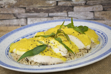 Pat the fish dry. Dust with cornflour and season. Heat the oil in a non-stick frying pan. Pan-fry the fish for about 2 minutes each side depending on thickness. Serve immediately topped with the sauce. Serves 4.