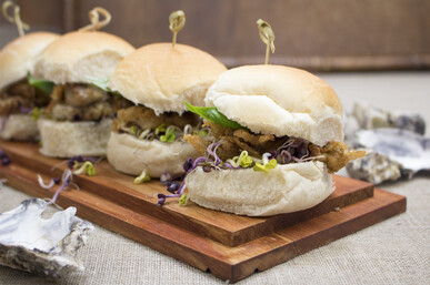Pile 2 oysters on each slider base, top with more sprouts, the basil, then the bun tops.