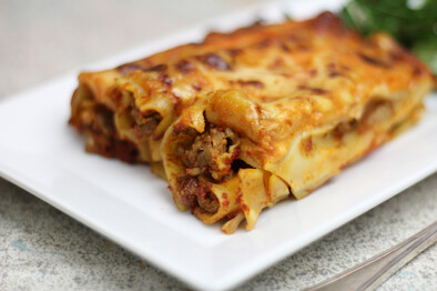 Cannelloni is derived from the Italian word ‘cannellone’ meaning big pipe. It is delicious stuffed with a variety of tasty fillings, covered in sauce and baked. In America the same dish is called manicotti.