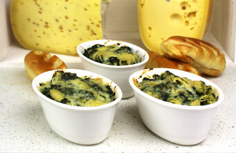 Melt the butter in a large saucepan on low. Sauté the shallots, until softened. Add the garlic. Sauté for 1 minute. Stir in the oregano, cornflour and seasonings. Gradually pour in the milk. Cook, stirring, until thick. Sprinkle in 3/4 of the gouda. Add the well-drained pasta and spinach. Pour into a 6-cup casserole or individual baking dishes. Sprinkle with the remaining gouda.