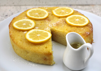 Meanwhile, stir the lemon juice and sugar on low heat until the sugar is dissolved. With a fine skewer make a few holes in the cake. Drizzle about 1/4 of the syrup over the hot cake. Serve the remainder on the side.