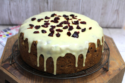 This light fruit cake should be covered and stored in a cool place for at least 3 weeks before cutting. Ice with a white chocolate ganache to which icing sugar has been added. Or just dust with icing sugar.