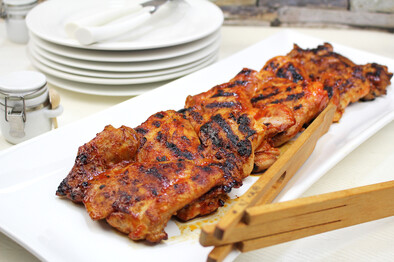 Preheat the barbecue to medium-high. Grill the chicken for about 3 minutes each side. Brush lightly with the glaze. Turn the thighs over and cook for a few seconds. Repeat this process until the chicken is nicely coloured and cooked through. Serves 4-6.