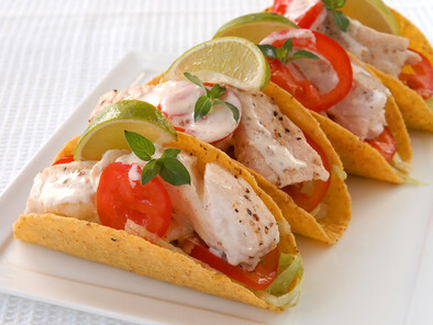 Fill with the lettuce, avocado and tomatoes, top with a little sauce, then the fish and a little more sauce. Serve immediately with a lime wedge. Serves 4 as a main or 8 as a starter.