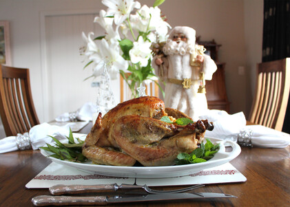 Increase the oven temperature to 190°C. Return the turkey to the oven and cook for 5-7 minutes until the skin has browned. Cover with foil and a heavy towel. Rest for at least 20 minutes before carving.