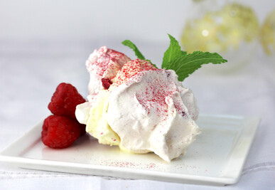 Beat the egg whites until soft peaks form. Add the caster sugar, a tablespoon at a time, beating well after each addition. Beat until stiff and shiny. Roughly crush the dried raspberries. Fold into the meringue with the rosewater and red colouring.