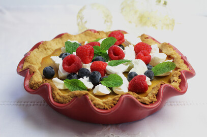 Roll out the chilled pastry to form a 30cm disc. Line the pie dish with the pastry and trim the edges. Pat a sheet of foil over the pastry ensuring all the pastry is covered. Weigh down with pastry weights, if preferred. Bake for 15 minutes.