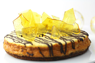 Before serving, drizzle a little chocolate in lines over the top of the cheese cake and allow to set. Garnish with the toffee shards. Serves 8.