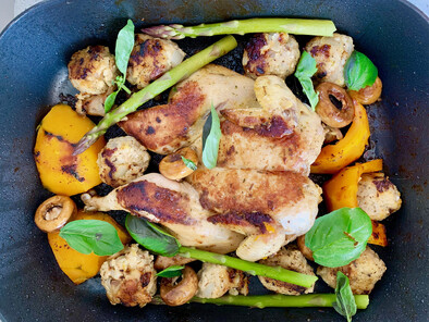 Heat the 2 tablespoons of rice bran oil in the frypan. Add the chicken and lightly brown on both sides on medium-low (120°C) heat. Cover and cook for 30 minutes turning once during cooking. Add the stuffing balls and buttercup.