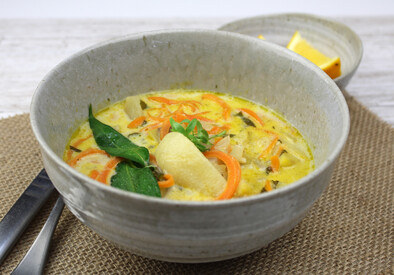 Just before serving, stir in the coconut milk, coriander and lemon juice and heat through. Serves 4.
