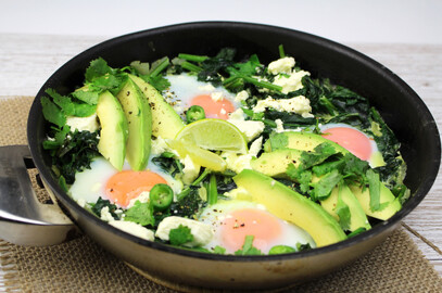 Make four small holes in the spinach. Break an egg into each. Cover and cook on medium until the eggs are just set, about 7 minutes. Season, sprinkle with the feta and chilli then add the avocado.