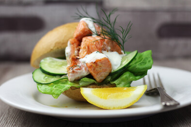 Cove the burger bun bases with lettuce and cucumber then top with the salmon and yoghurt sauce. Serves 3.
