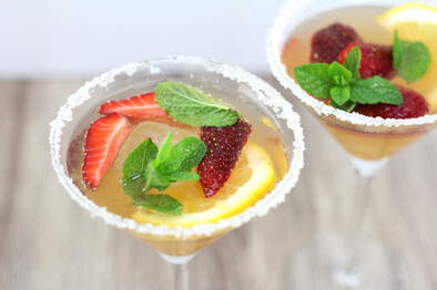 Dip the rims of 2 glasses into the lemon juice then into the sugar. Chill.