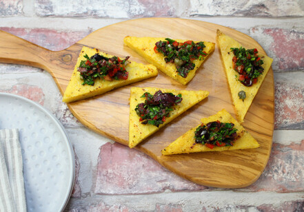 These gluten-free bruschetta prepared from polenta are great served as nibbles (use a small fork for eating) or as a light meal with a salad. The bruschetta are also excellent topped with sautéed mushrooms or pesto and feta.