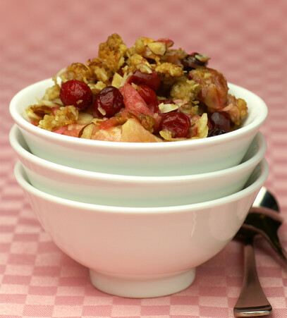 Combine the topping ingredients and sprinkle over the fruit. Bake for about 30 minutes, until the top is golden. Serves 4-6.