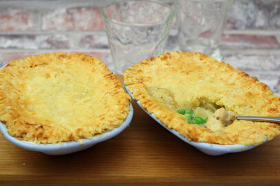 Place the chicken in a shallow pie dish or four individual pie dishes. The mixture should come close to the top.