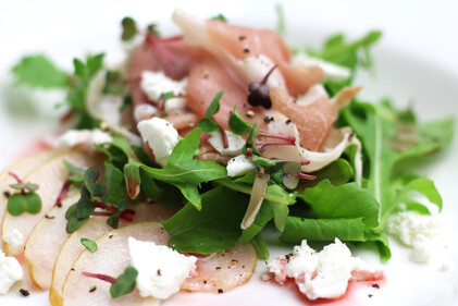 Quarter and core the nashi. Cut into paper-thin slices. Place the rocket evenly onto 4 salad plates. Add the nashi. Top with curls of the prosciutto. Garnish with crumbled goats chees and micro greens, if using. Drizzle with the vinaigrette. Serves 4